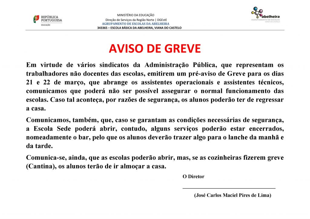 Aviso de greve março 19, 2019 Escrito por Diretor Publicado em NOTÍCIAS 0 Comentários Destaque Mais nesta categoria: « Provas Finais e de Equivalência à Frequência Agradecimento de Sua Excelência o Embaixador do Brasil em Portugal - Minuto de silêncio » Deixe um comentário Certifique-se que coloca as informações (*) requerido onde indicado. Código HTML não é permitido. Mensagem * digite a sua mensagem aqui ... Nome * E-mail * URL do Sítio