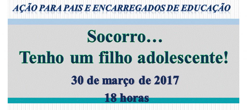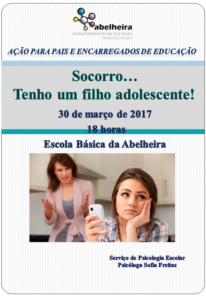 Convidam-se os pais e/ou encarregados de educação dos alunos dos 7º e 8º anos de escolaridade a assistir a uma ação de sensibilização sobre as questões da adolescência e os desafios parentais intitulada “Socorro… Tenho um filho adolescente!”, no próximo dia 30 de março, pelas 18 horas na Escola Básica da Abelheira.