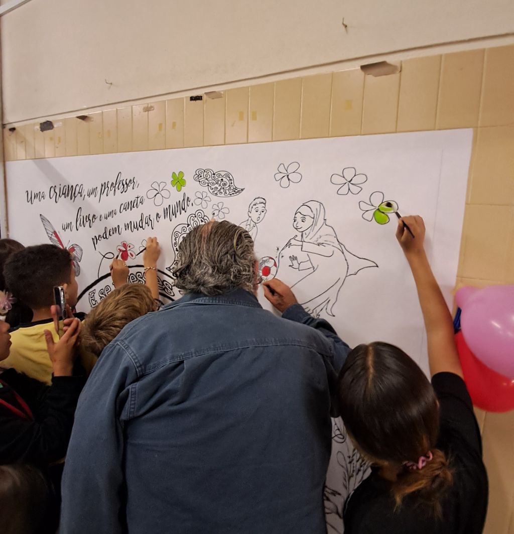 No final do concerto inaugurámos o mural coletivo da escola, alusivo aos direitos da criança, proposto pelo Gabinete de Apoio ao Aluno, baseado no livro: “Malala e o Lápis Mágico”. Malala Yousafzai foi a pessoa mais nova a receber o prémio nobel da Paz, aos 17 anos, pela sua defesa pelos direitos das meninas e mulheres a terem acesso à educação. Toda a comunidade educativa deu o seu contributo colorindo o mural.