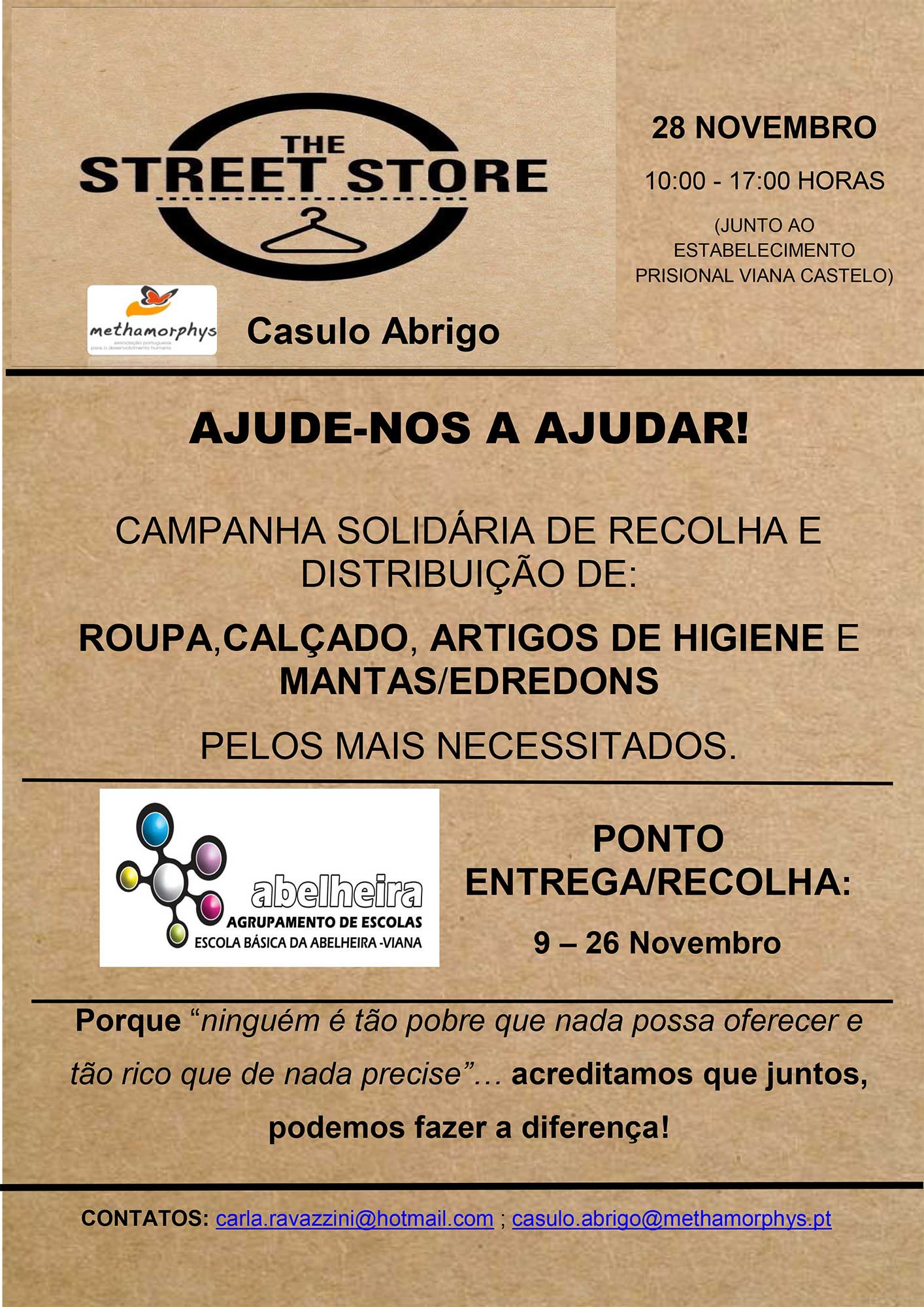 No próximo dia 28 de novembro terá lugar um evento na cidade denominado “Street Store” onde será exposta roupa e outros produtos de necessidade básica para os que mais precisam. O Agrupamento participará com a recolha de roupa que que for possível reunir nas próximas duas semanas e que será colocada num caixote designado para o efeito. PARTICIPEM.