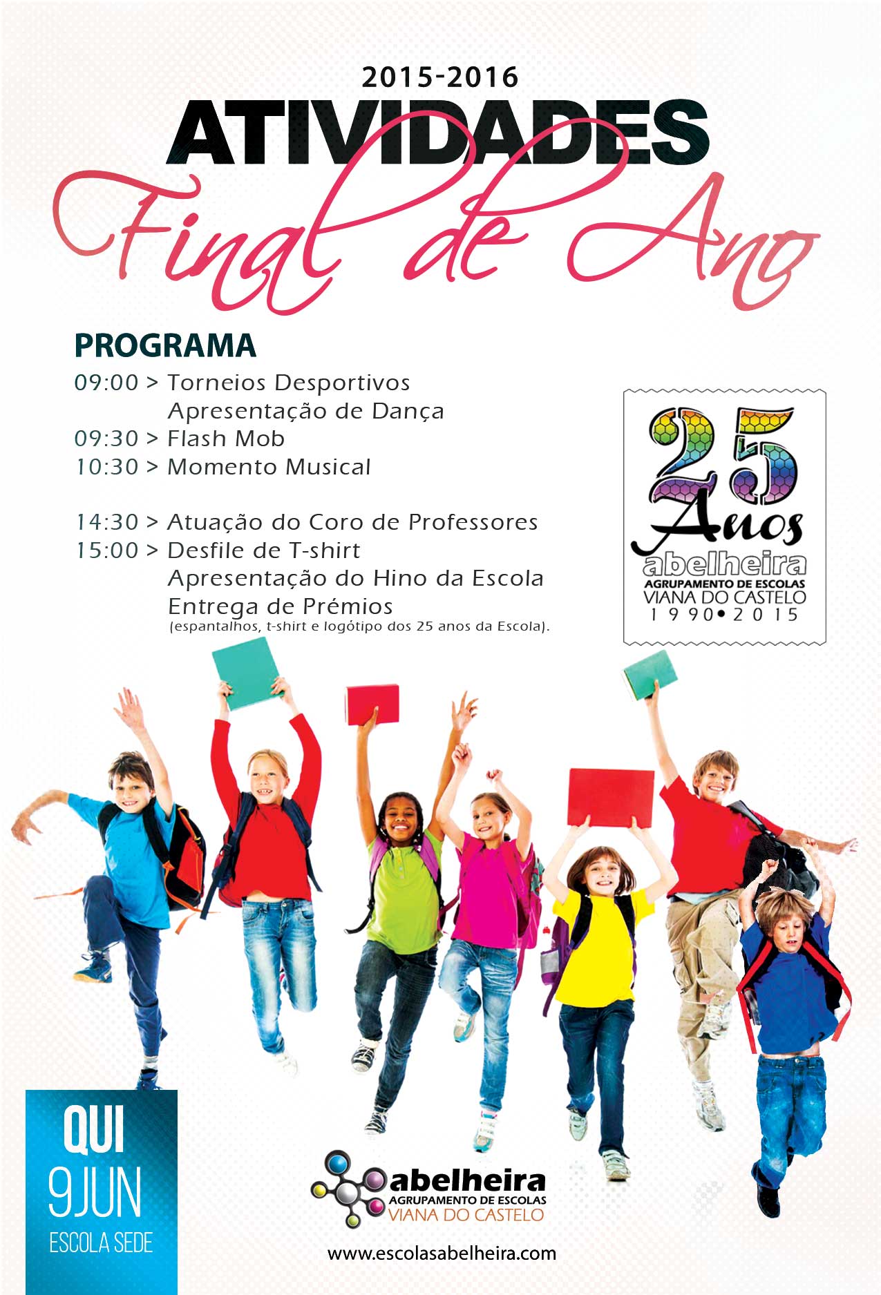 A comissão organizadora dos 25 anos da escola da Abelheira, tem o prazer de anunciar a programação para as atividades a desenvolver no dia 9 na Festa de Final de Ano 2015-16. A todos se apela para a participação ativa nas atividades.