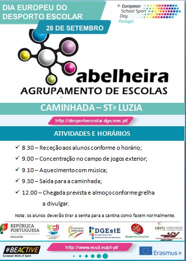 O Clube de Desporto Escolar e os grupos disciplinares de Educação Física do Agrupamento de Escolas da Abelheira vão realizar o Dia Europeu do Desporto Escolar, no dia 28 de setembro de 2018.